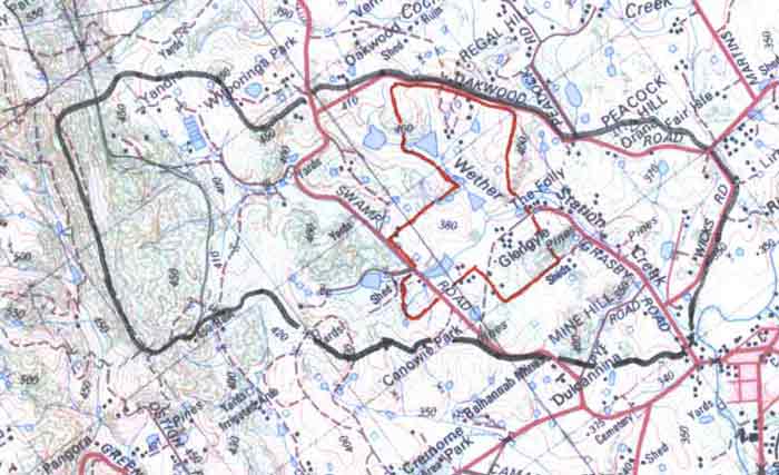 Location and boundary of the WSCC (shown with black line) and properties location of Stage 1 work (shown with red line). The township showing in the lower right corner is Balhannah. Swamp Road and Grasby Road are close to North-South orientation with North at the top of the map.